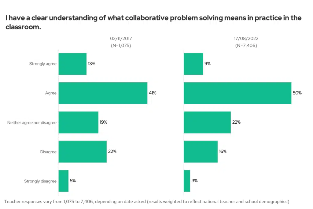 A further note of interest: fewer teachers say they have never tried collaborative problem solving activities in their lesson plans, compared to 2017. Could it be that more people tried it, but didn’t find it useful?