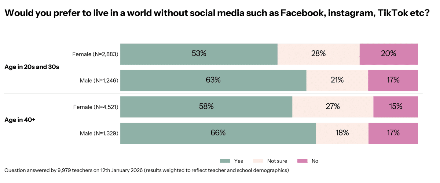 And when it comes to social media for yourselves, many would also like a version of the world without the ping and pressure of posting, liking and sharing.Men are more likely than women to say they want rid of socials: 53% of female and 63% of male teachers in their 20s and 30s would prefer a social-media-free world. Older teachers are more likely to agree they would like a world without social media: 58% of female teachers and 66% of male teachers aged 40+.