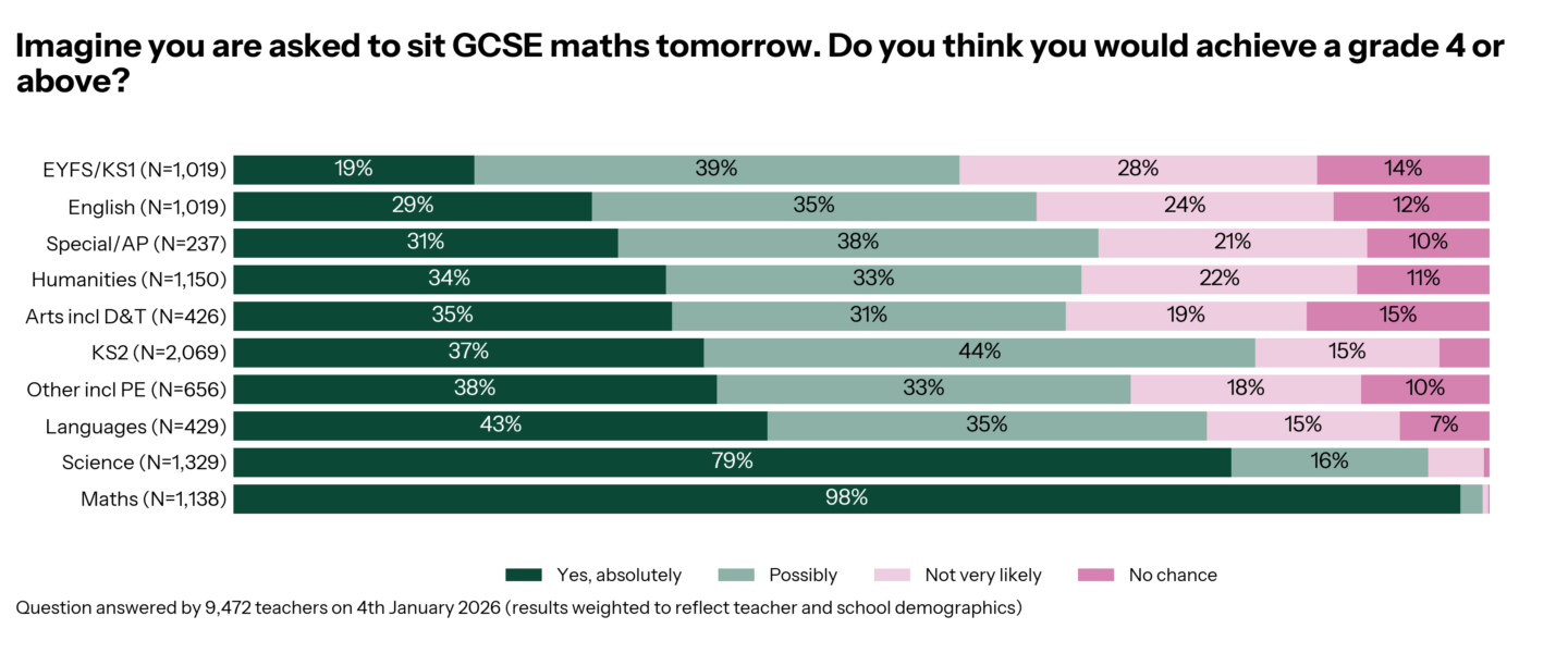 Unsurprisingly, our maths teachers are super confident in their mathematical prowess (98% say they absolutely would pass), and science teachers were also very confident (79%), but then everything takes a bit of a dip.