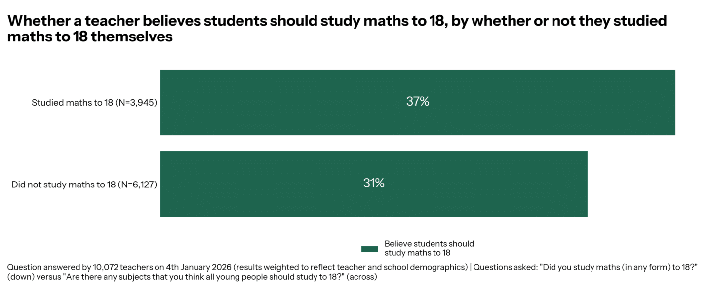 All students study maths until age 16, but should this be extended to 18? At one point, this was the idea floated when the British Baccalaureate was announced in 2023 (and then promptly dropped when the government changed in 2024). Most teachers don’t think maths should be studied to 18, but 37% of those who studied maths themselves to 18 believe students should, but the same is true for only 31% of those who did not study maths to 18.