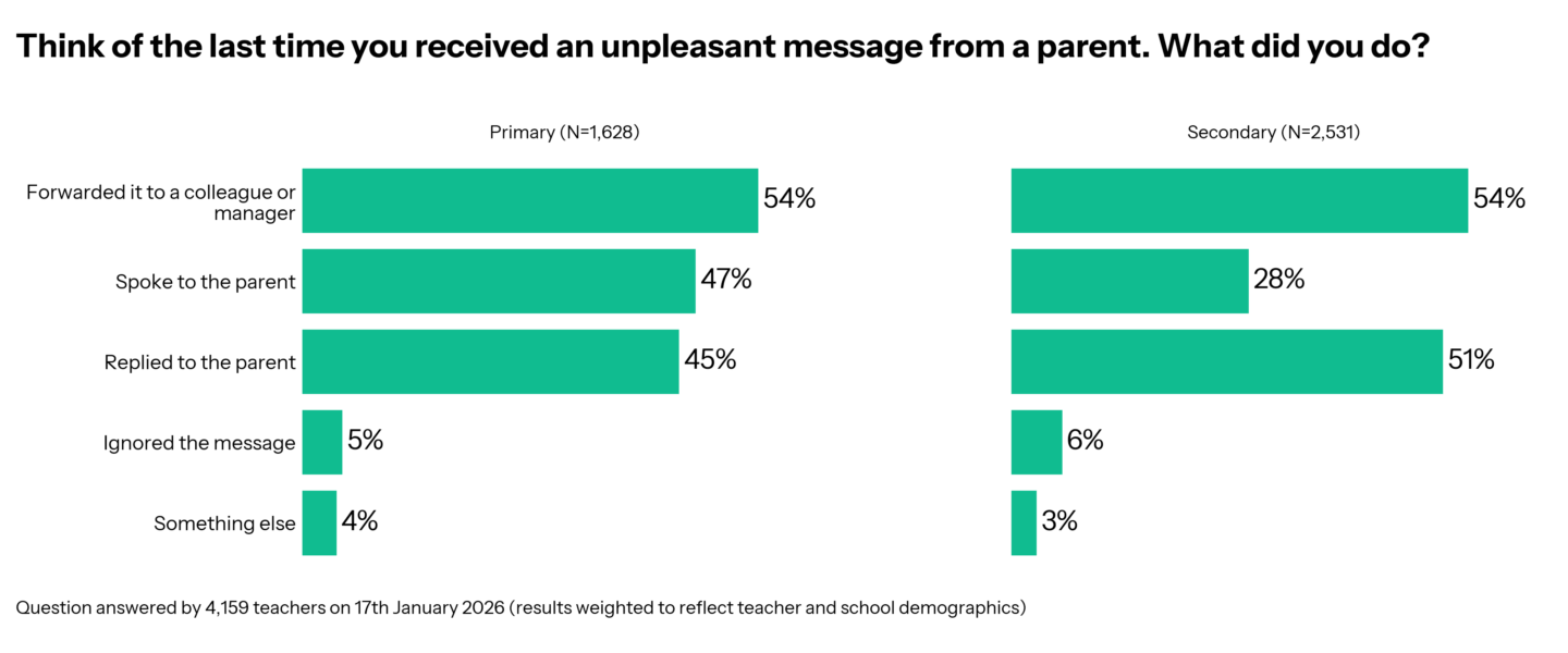 Teachers were also more likely to reply to the parent in the real-experience group, compared to the hypothetical group. Among primary hypotheticals, 31% thought they would reply to the parent’s message, but the reality was 45%. Similar picture among secondary teachers with 43% predicting this would be their action, but 51% did it the last time they had an unpleasant message.