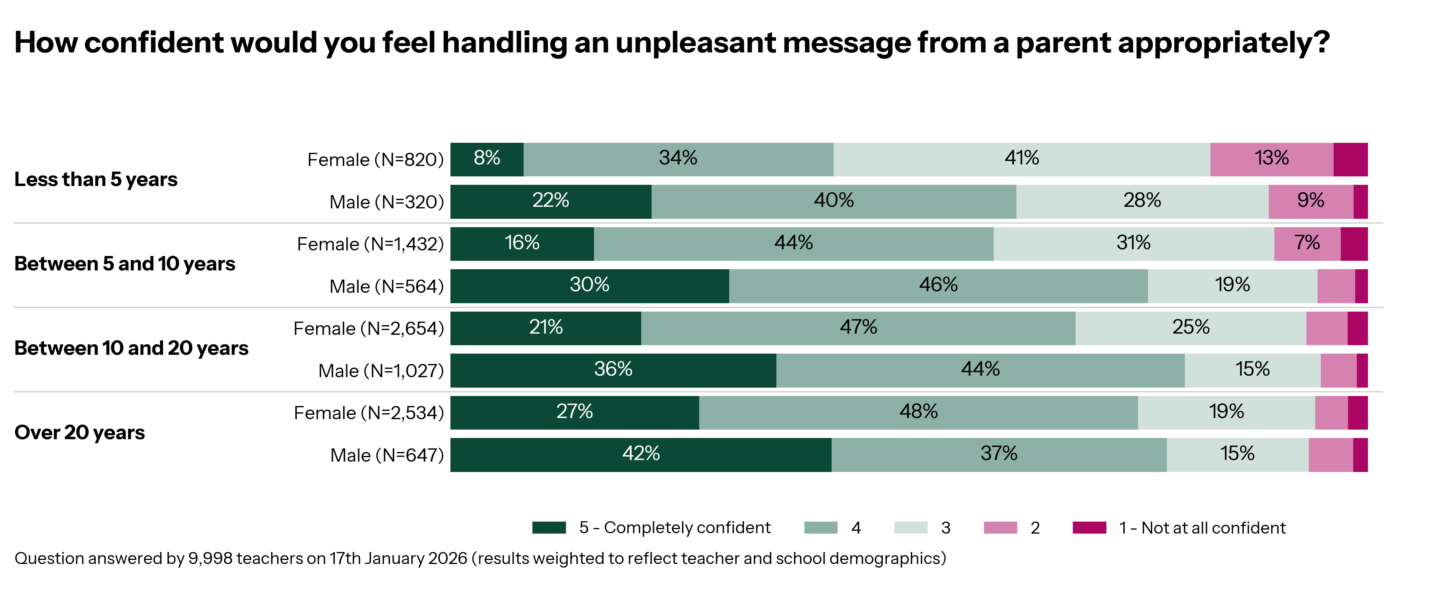 However, this almost halves among classroom teachers who report their school does not have clear guidance on responding to inappropriate parent communication: just 13% of teachers feel ‘completely confident’.