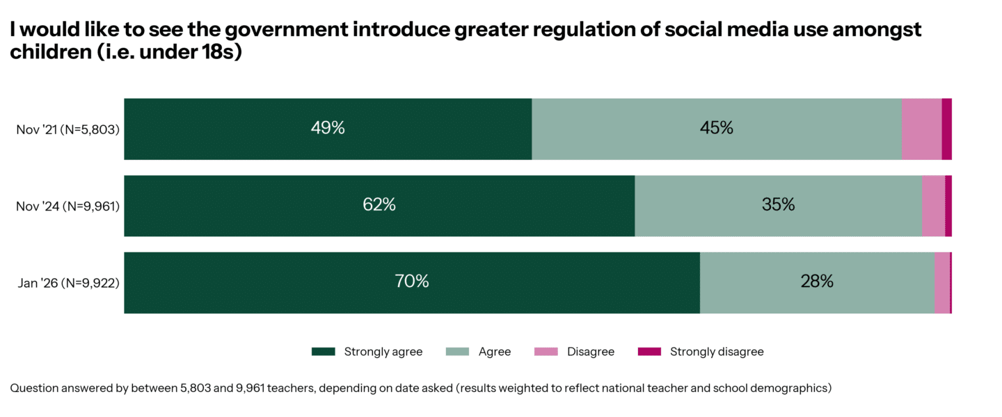 How popular would a similar ban be in England? Among teachers, it would appear to be very popular. Comparing results from this month to previous years, the strength of feeling on this topic is increasing: in 2021, 94% agreed, today that figure is UP to 98%, with those strongly agreeing jumping from 49% in 2021 to 70% in 2026.