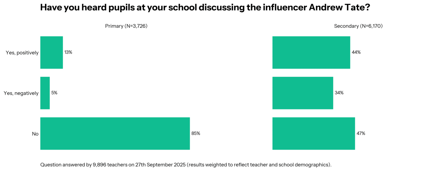 This year, more than 50% of teachers have heard students discussing Andrew Tate in secondary school, but of those, 44% have heard positive conversations, and 34% negative (of course, some have heard both!).