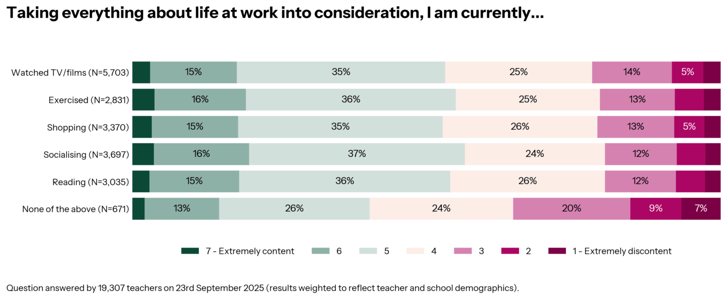 So what shifts the dial on feelings of contentment? Teachers who exercised or socialised on the weekend were more likely to report higher levels of contentment compared to teachers who said they didn’t participate in any of the activities on the list (20% vs. 15% scoring at least 6 out of 7).