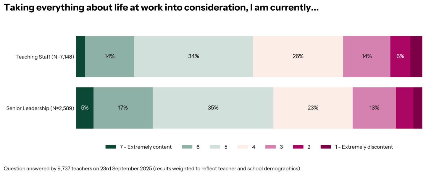 Digging a little deeper into the data, those who are more senior report higher levels of contentment. 17% of teaching staff rated themselves at least a 6 out of 7 score, but the same was true for 22% of senior leadership