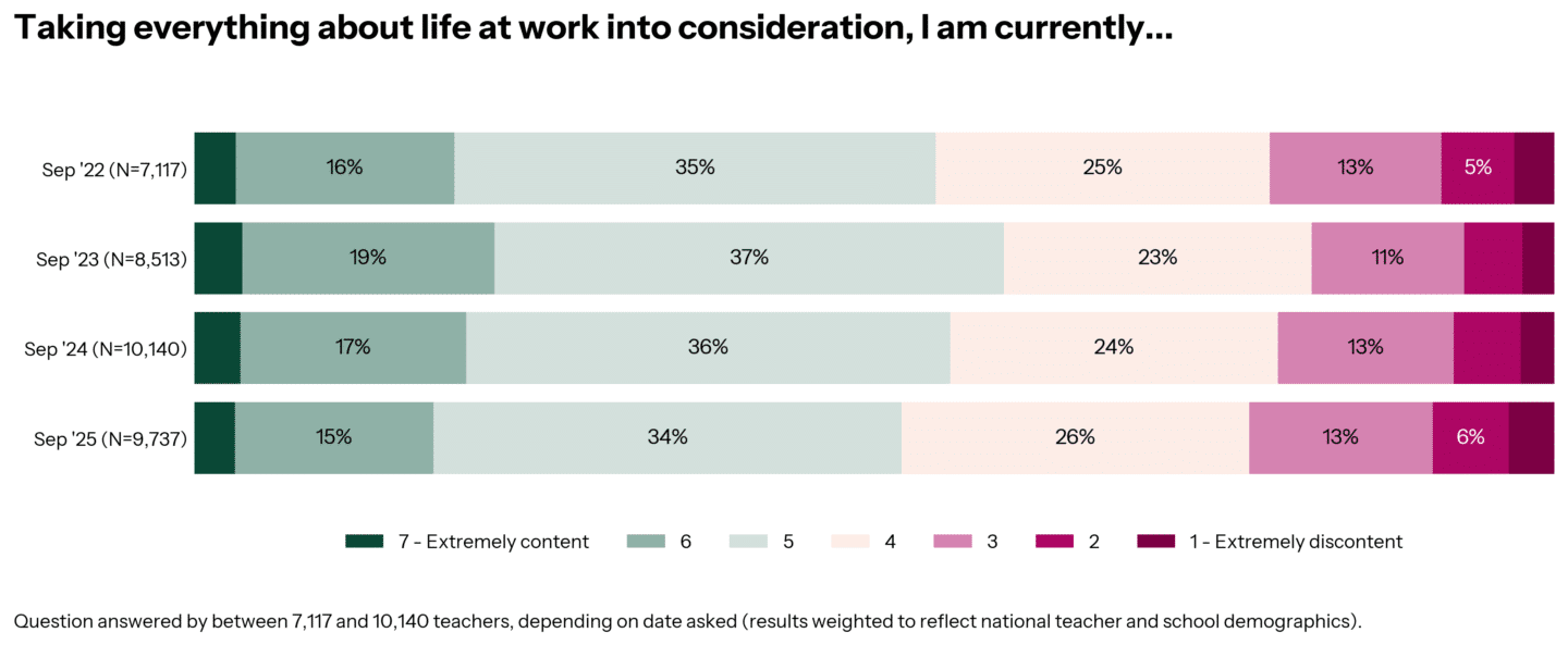 Teachers who rate themselves 7 out of 7 for contentment are almost TEN times more likely to say they’re looking forward to returning to work after the holiday compared to teachers who gave themselves 1 out of 7 (29% vs 3%).