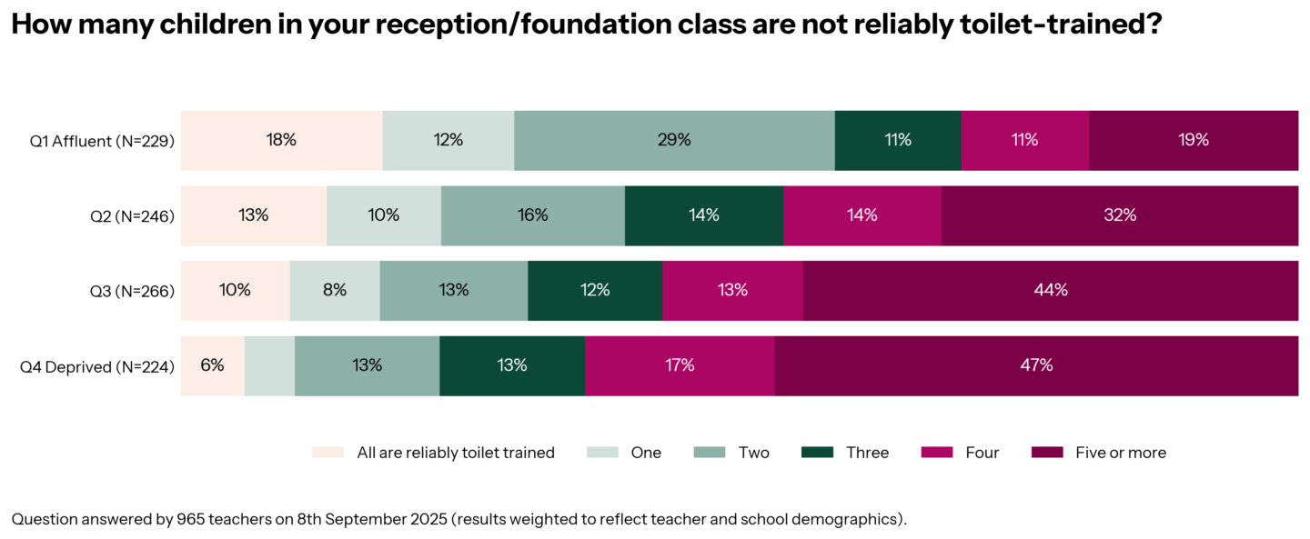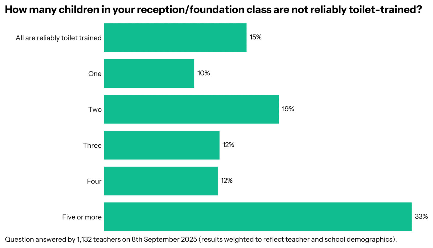 Overall, 85% of teachers say children in their reception classes are not yet toilet-trained, and a third of teachers reported that their reception classes have five or more students who are not reliably toilet-trained.
