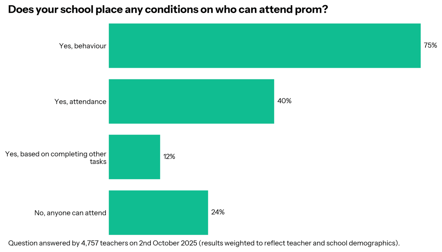 Among those schools still holding celebrations, three-quarters of teachers say their school has conditions for entry, with 75% citing behaviour, 40% attendance, and 12% reporting that there are other tasks that have to be completed before students are allowed to go to prom.