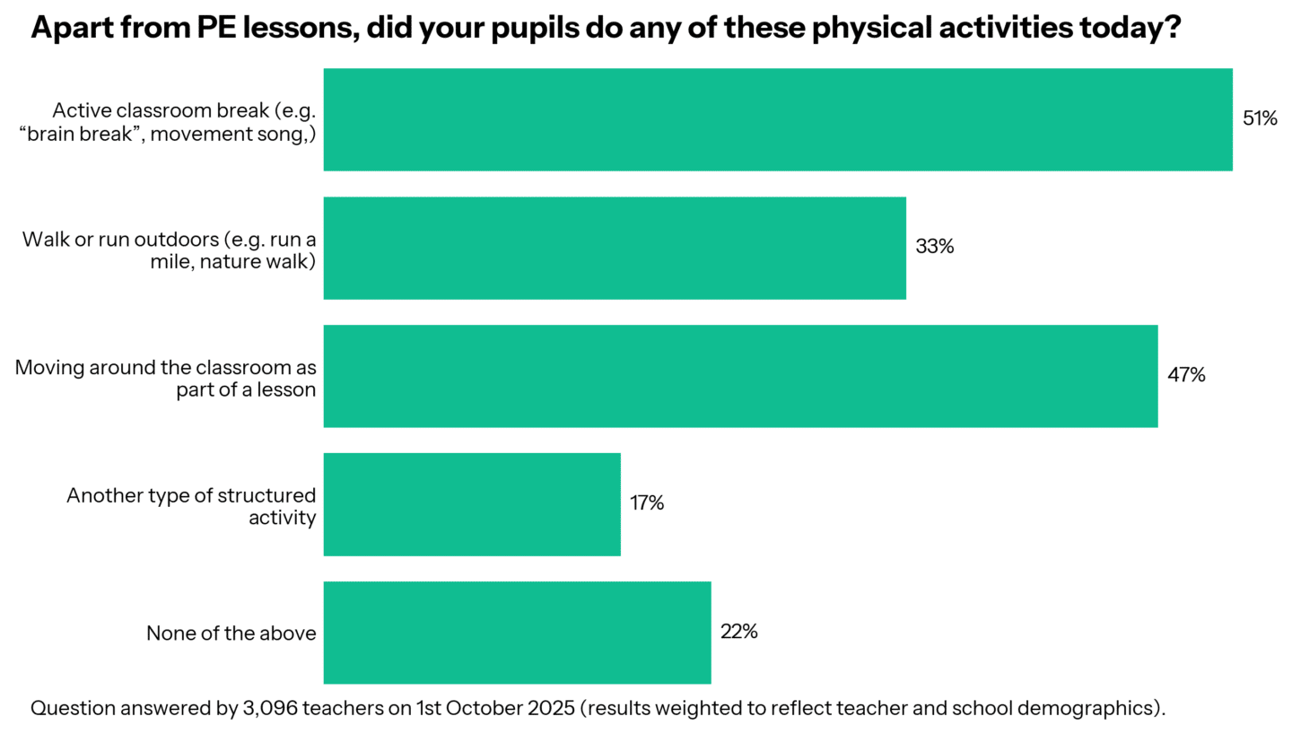 Lessons are looking pretty active: 51% gave their students a movement break, a third went outside for a Daily Mile-style run or walk, and 47% moved around the classroom as part of a lesson. Just 22% didn’t do any non-PE physical activity.