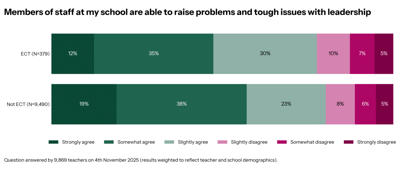 In this respect, it isn’t good news. ECTs are less likely to feel they can raise problems with leaders (12% “strongly agree” vs 19% of experienced staff).