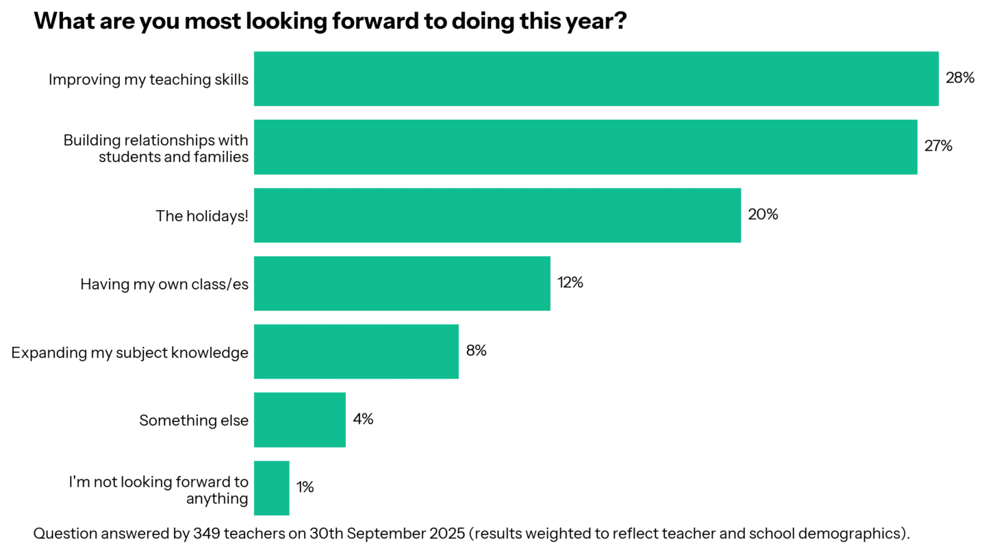 Onto some more positive news, we dug into what motivated ECTs, and the findings suggested an enthusiastic crop of teachers. Almost every ECT (99%) said they had things they were looking forward to this year – most often improving their teaching (28%) and building relationships (27%).