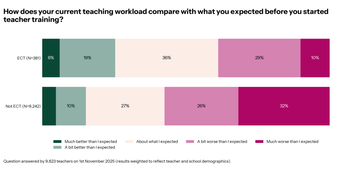 Are ECTs prepared for life in the classroom? The good news is that for the majority, the answer appears to be ‘yes’. When we asked teachers how their current workload matched up to their expectations, 36% reported it was what they expected, and a quarter reported it was actually better than they expected. This is a dramatic difference to non-ECTs, where just 27% felt it matched their expectations, and only 15% reported it was better.