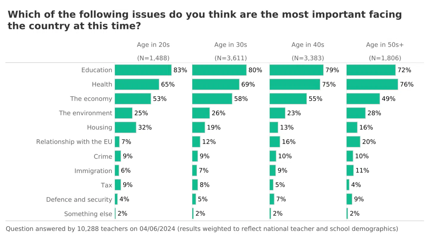Unsurprisingly, education, health and the economy come out as top priorities for all teachers regardless of seniority. In fact, there seems to be very little variance across the board – with the exception of housing, which is more pressing among younger teachers.