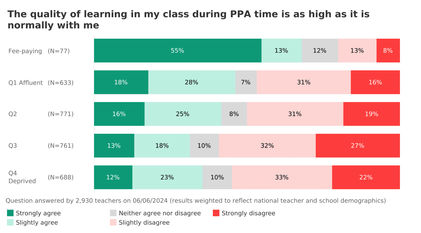 When broken down by the number of FSM (Free School Meal) pupils, we see that in more affluent areas, more teachers are likely to strongly agree or agree that the quality remains high. Additionally, it’s worth considering that in fee-paying schools where 55% of teachers ‘strongly agreed’ that the quality was as high, the most common response (45%) was that another teacher covers the PPA.