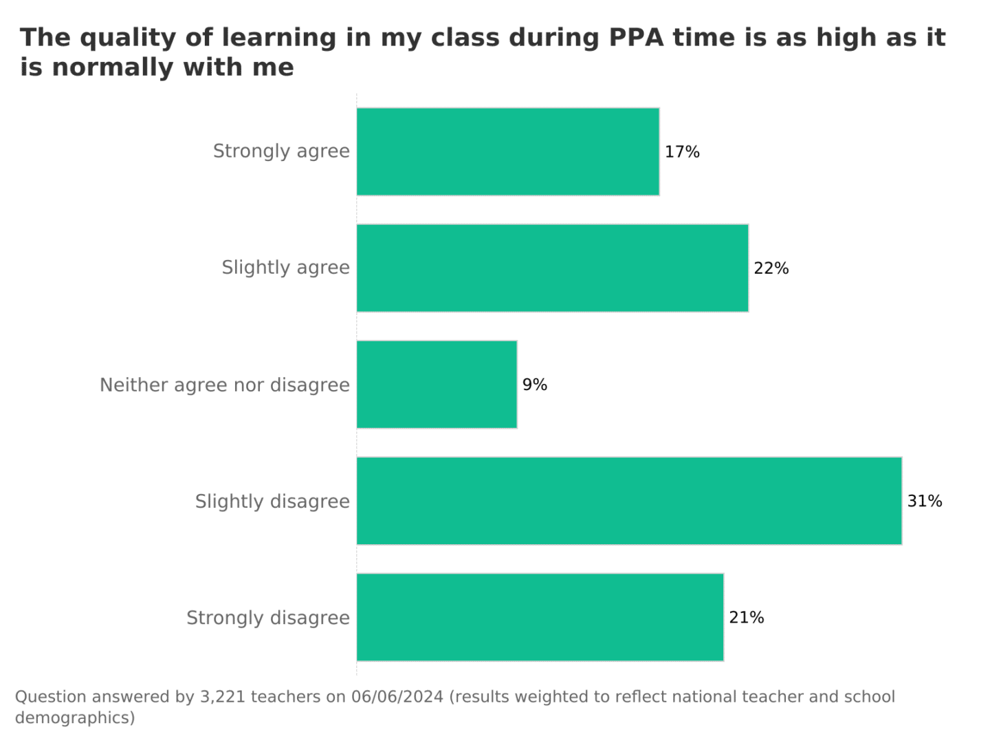 When we have previously asked about who covers a class when a primary teacher takes PPA (Planning, Preparation, and Assessment) time, the most common answer was an HLTA (Higher Level Teaching Assistant) at just under a third. This was followed by another teacher (24%) and a TA (Teaching Assistant) at 13%.