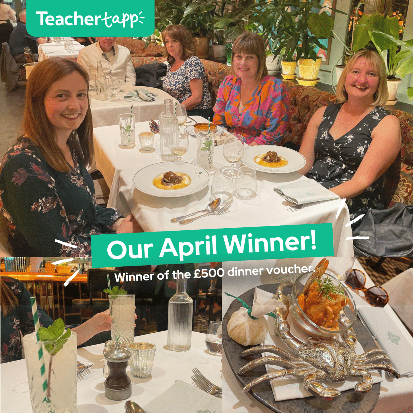 Here she is 👇 enjoying her dinner out on Teacher Tapp with her teacher friends. In the May half term, she took her work besties to The Ivy and Teacher Tapp picked up the tab. We particularly liked the green themed cocktails and like to think that was in honour of us 💚.