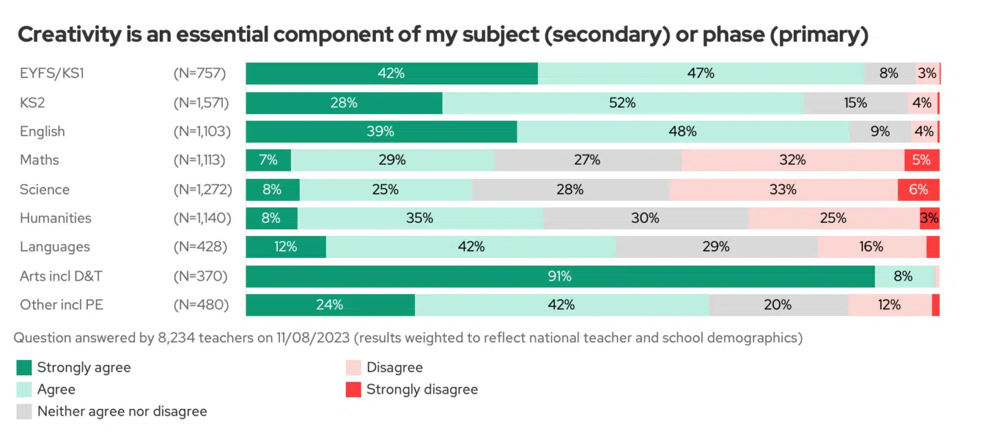 We asked some user-suggested questions about creativity last week. First, we asked whether creativity is an essential part of your subject/phase. The subject breakdown was instructive – if unsurprising. Under 10% of maths, science and humanities teachers strongly agreed creativity was essential – whereas over 90% of arts teachers strongly agreed, alongside 42% of EYFS/KS1 teachers and 29% of English teachers.