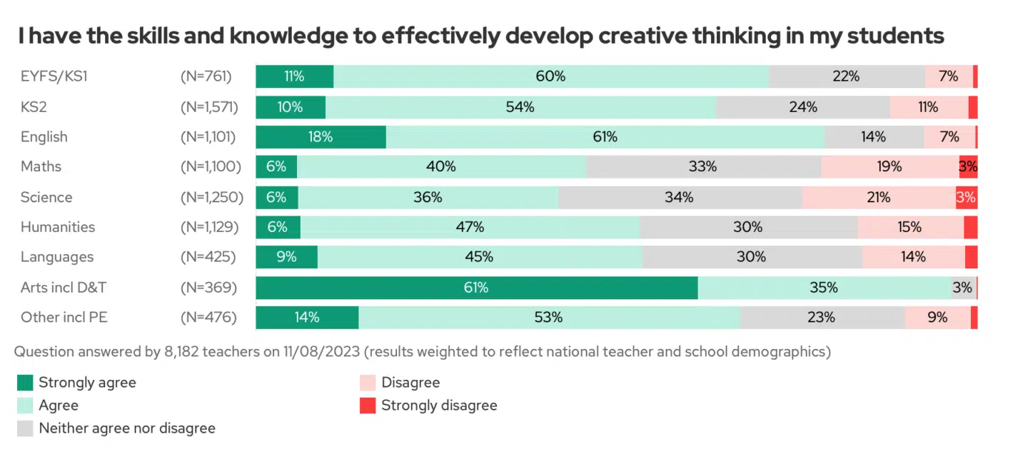 Interestingly however, while most arts teachers agreed they had the skills and knowledge to develop creative thinking in their students, EYFS/KS1 and English teachers were much less likely to agree strongly.