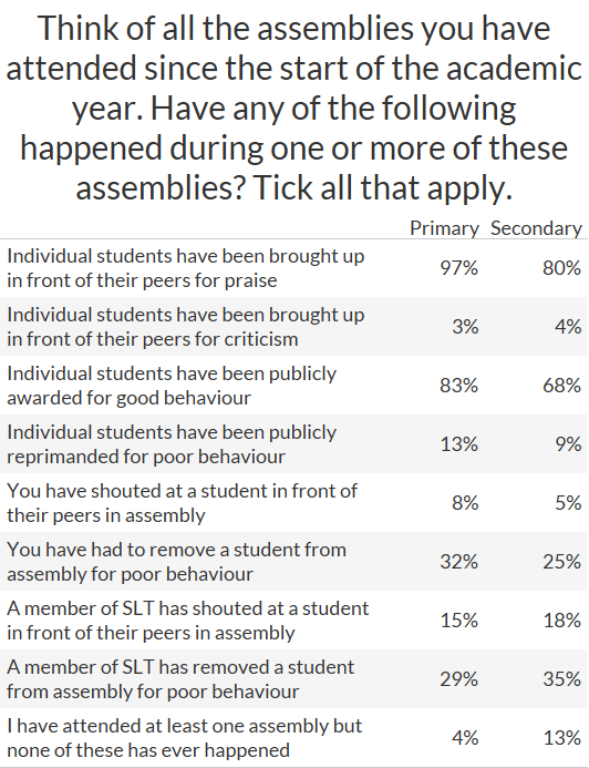 Notably, primary teachers saw more individual students reprimanded for poor behaviour and were more likely to remove or shout at a child themselves during assembly, compared to secondary colleagues.