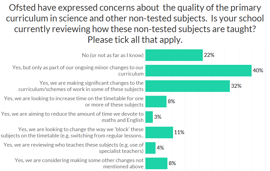 BUT, around a third of schools (32%) are making significant changes, with some increasing time for subjects that aren’t English and maths, and reviewing the use of specialist teachers.