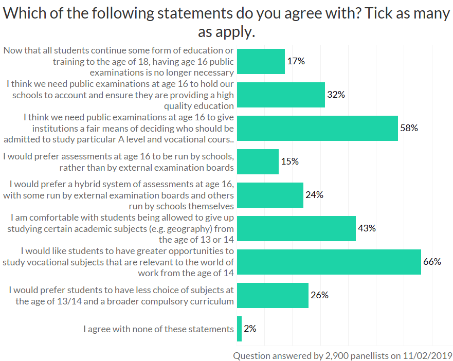 In reality, teachers have all kinds of reasons for thinking GCSEs may be important. For example, around a third of teachers (32%) felt GCSEs were an important accountability measure for schools. More than half (58%) said that exams at 16 were needed to decide who should be admitted onto A-level courses.