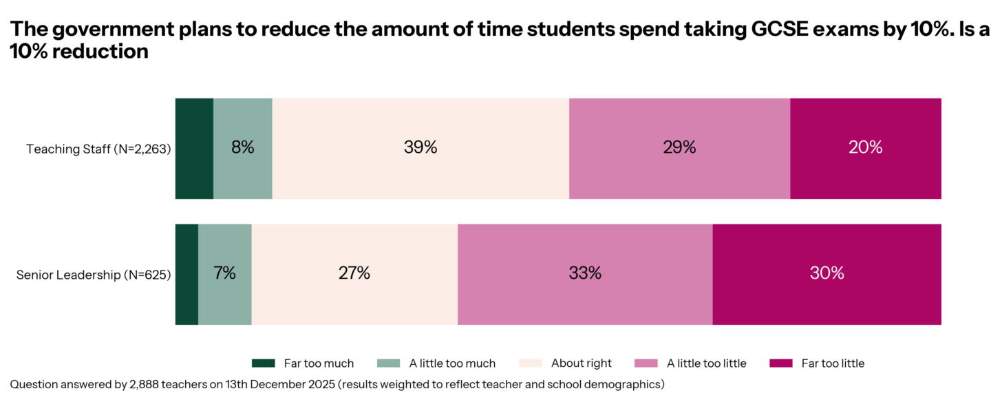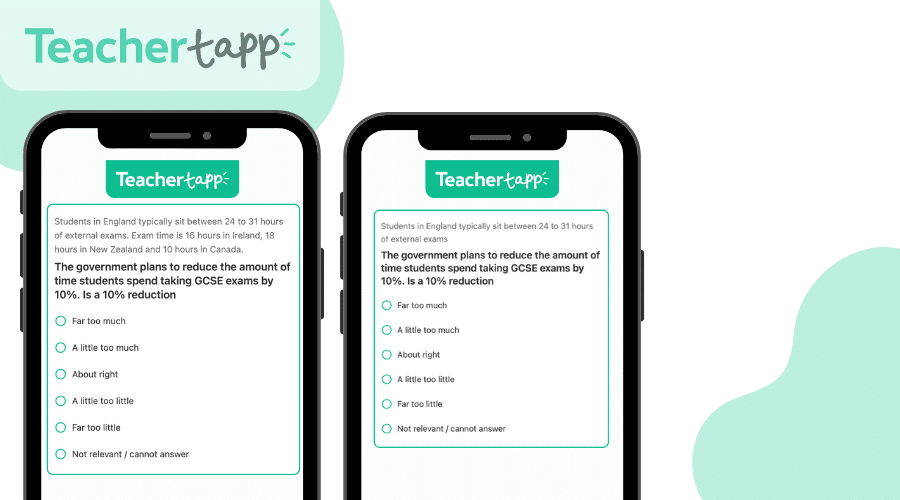 Having the information about different countries could change perceptions about our own exam time. We polled teachers on their opinion on the 10% cut. In one version, we added context (anchors) and in another, just the England entitlement with ‘too much or too little’.