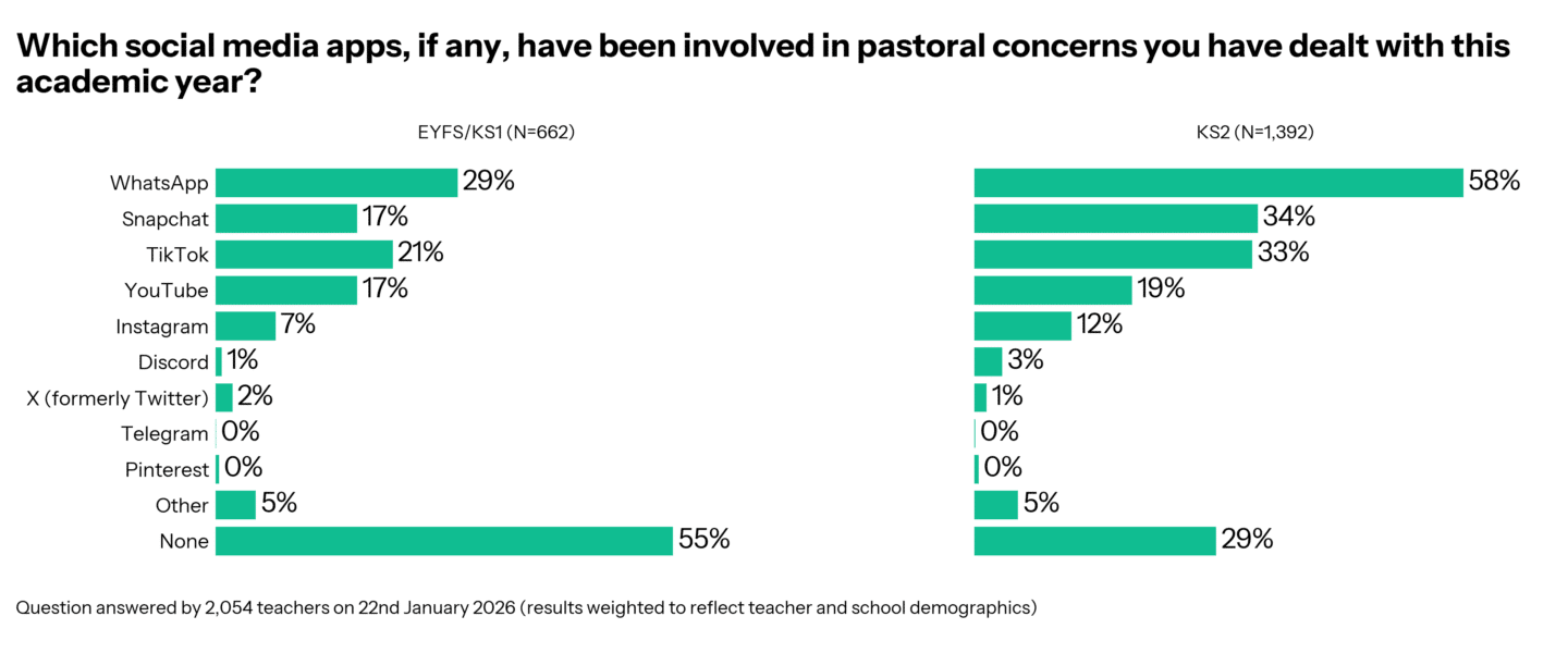 Taking primary teachers first, it’s clear the problem is very much concentrated in KS2, however, that doesn’t mean EYFS and KS1 teachers escape the issues related to social media. In EYFS/KS1, 45% of teachers had dealt with pastoral concerns that involved social media apps, and the same was true for 71% of KS2 teachers.