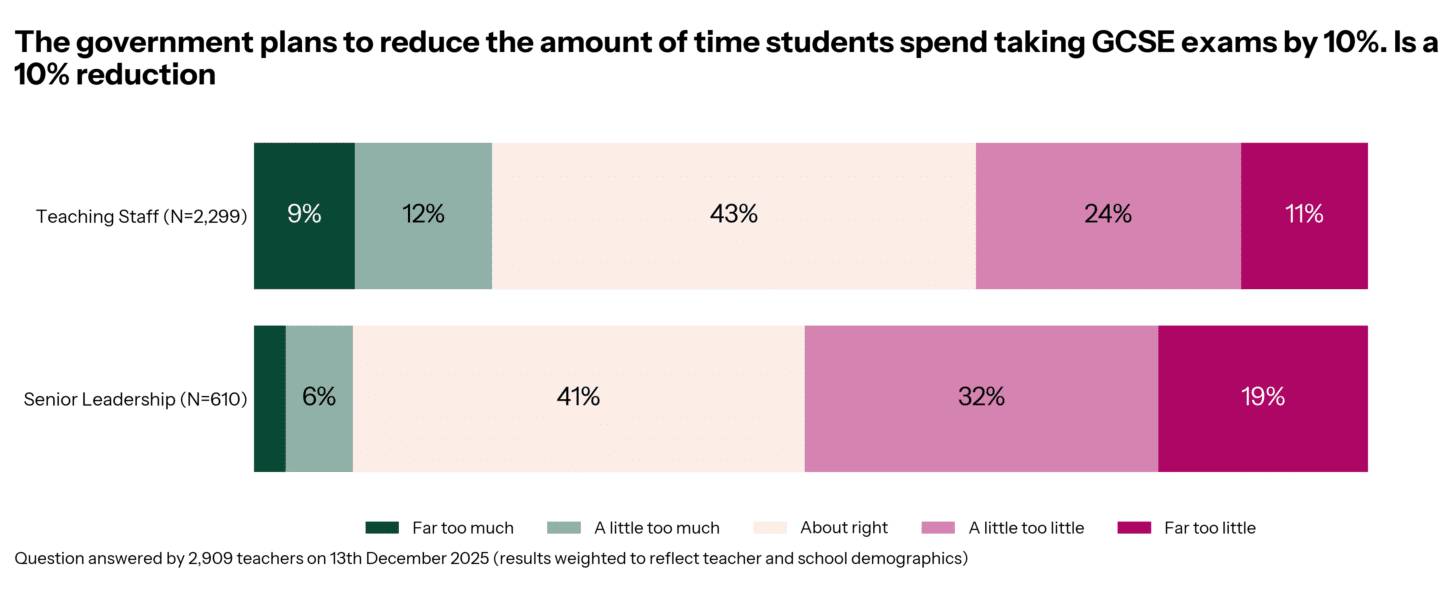 So what difference does anchoring make? When teachers and leaders see England’s exam time on its own, a 10% cut feels broadly “about right”. But add a bit of international context and views shift: concerns that the cut is too big fall away, and many more start to feel it doesn’t go far enough. This is anchoring in action – once people realise England is an outlier on exam time, the proposed reduction starts to look cautious rather than bold, especially to leaders who are more likely to think in system-wide terms.