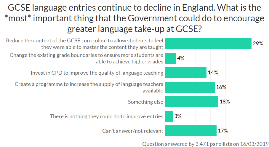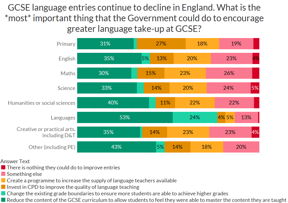 The EBacc has done little to stem the long-term decline in GCSE languages in schools. Can anything else be done? Most of you hear students talk about how languages are ‘too hard’, so you felt that reducing the content of the GCSE curriculum might encourage take-up.