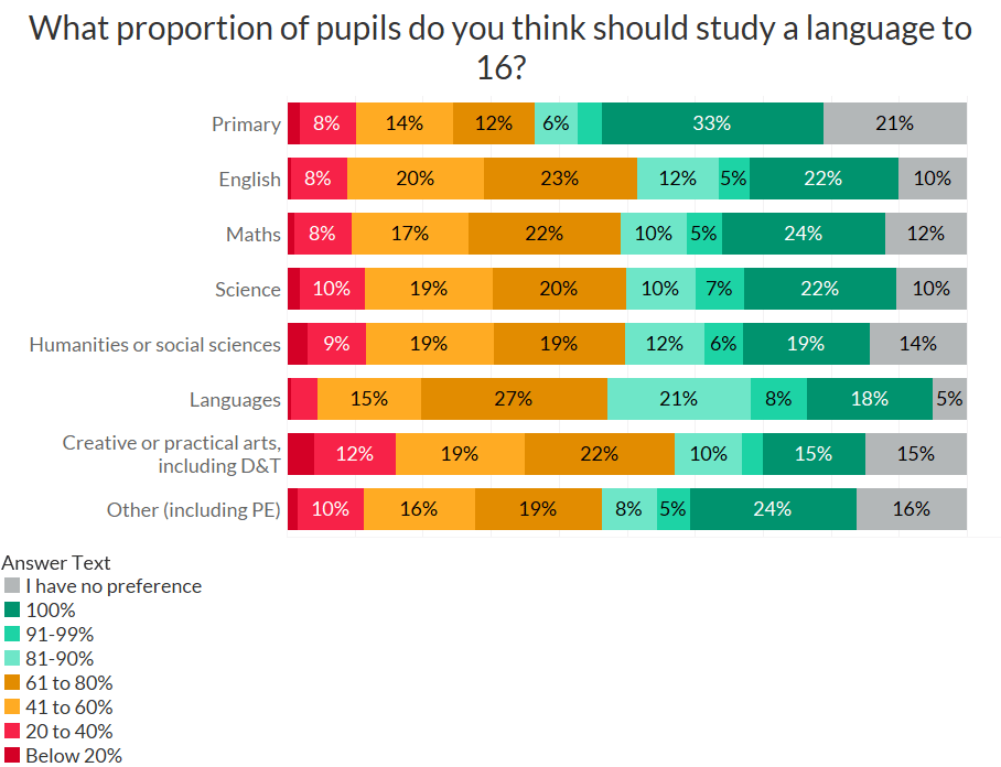 Surprisingly, our primary teachers are most likely to believe everyone should study a language to 16. Whereas our linguists aren’t so different to others in their beliefs about how many should study languages.