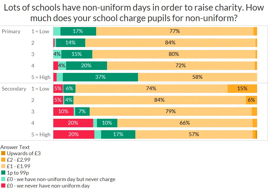 Schools have tended to charge £1 for out of school uniform day FOREVER! Given the rate of inflation, it is surprising that schools are still tending to charge £1 for out-of-uniform days, which was a standard charge even twenty years ago!