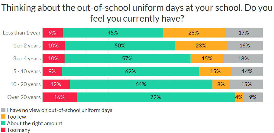 Do teachers think there are too many out-of-school uniform days? (like Becky does)? It turns out newbie teachers LOVE them and want more of them. It’s the more experienced teachers who seem a little less enthusiastic. (And it was good to see that almost every single headteacher felt they had EXACTLY the right number. Phew!)