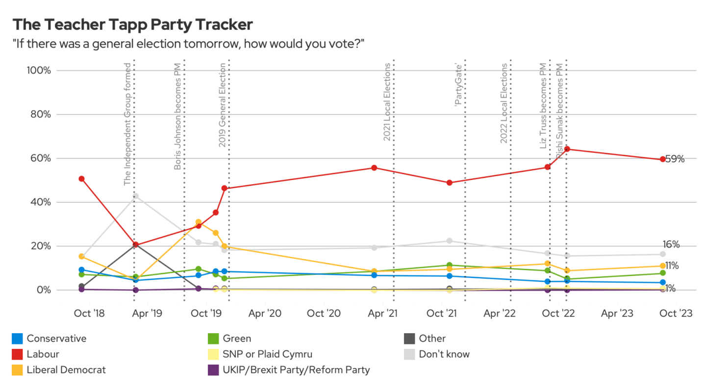 The last time we asked about voting intentions was during a particular peak of uncertainty, just after Rishi Sunak became Prime Minister. At the time, Tappers gave the the highest ever support for the Labour Party, with 64% saying you’d vote for them.