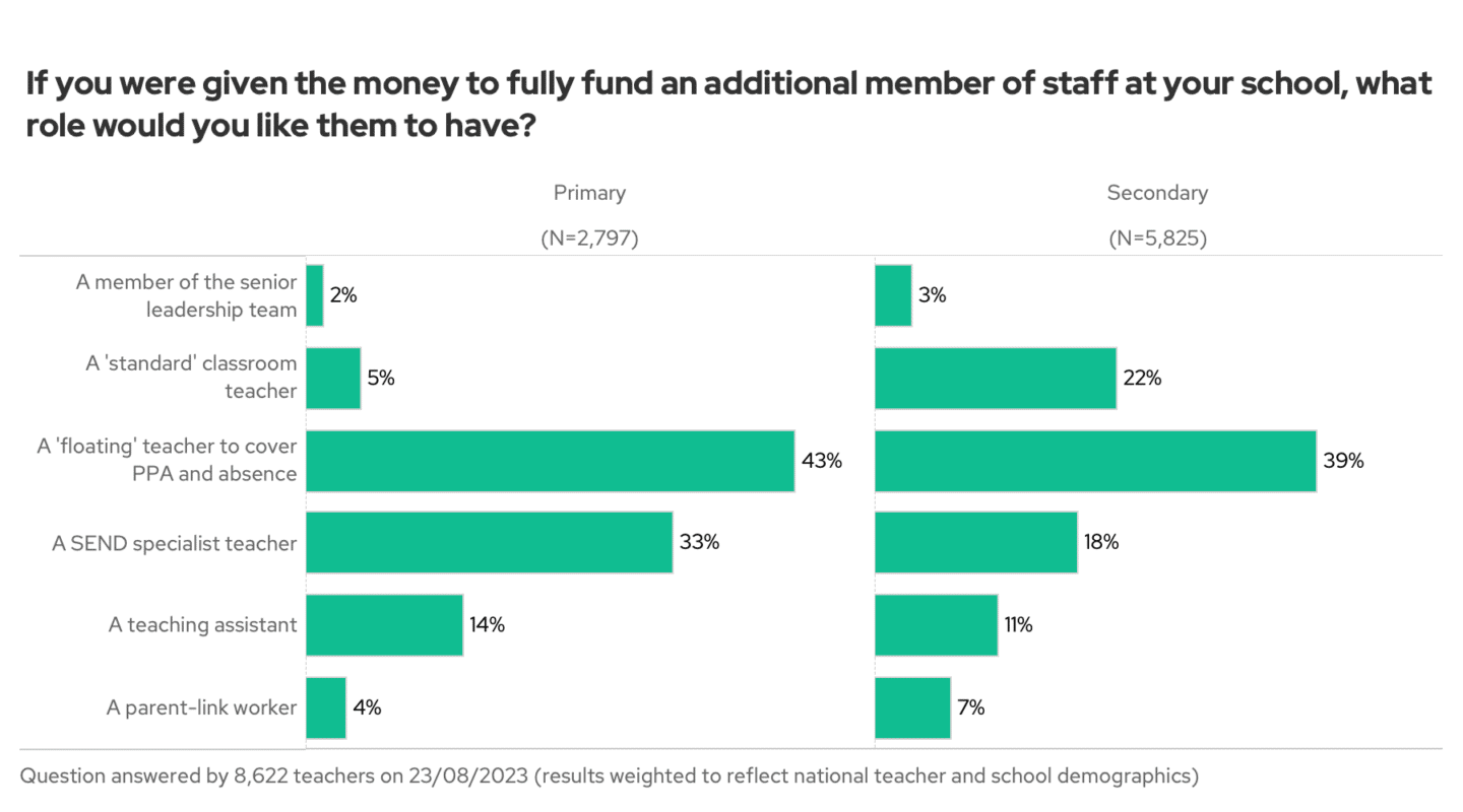 One-in-three of our primary colleagues would choose a SEND specialist teacher and 22% of secondary teachers wanted another ‘standard’ classroom teacher. This is similar to previous years’ results.