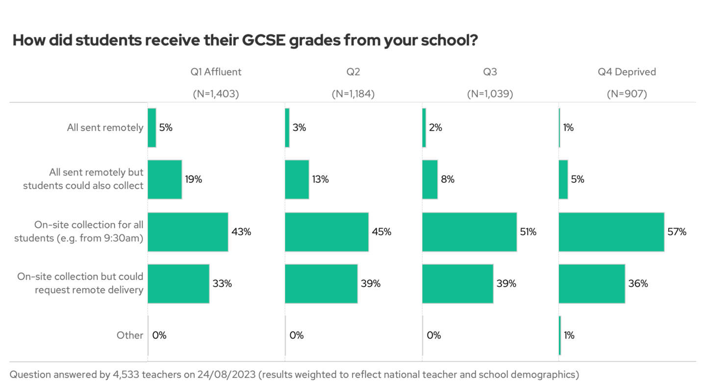 Happily for newspaper editors, just 6% of secondary teachers say their school sends results remotely, with the majority sticking with on-site collection. Schools in affluent schools were more likely to offer remote collection of results.