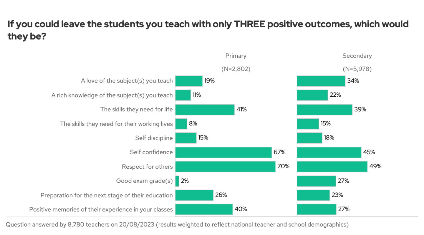 Hopefully all of your students got the results they needed, but… only 27% of secondary teachers say that good exam grade(s) would be in the top three school outcomes they would choose for pupils, if they could.