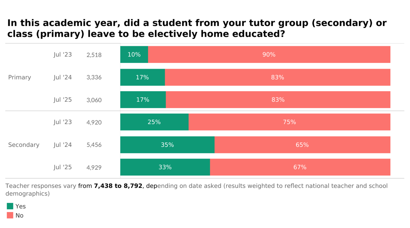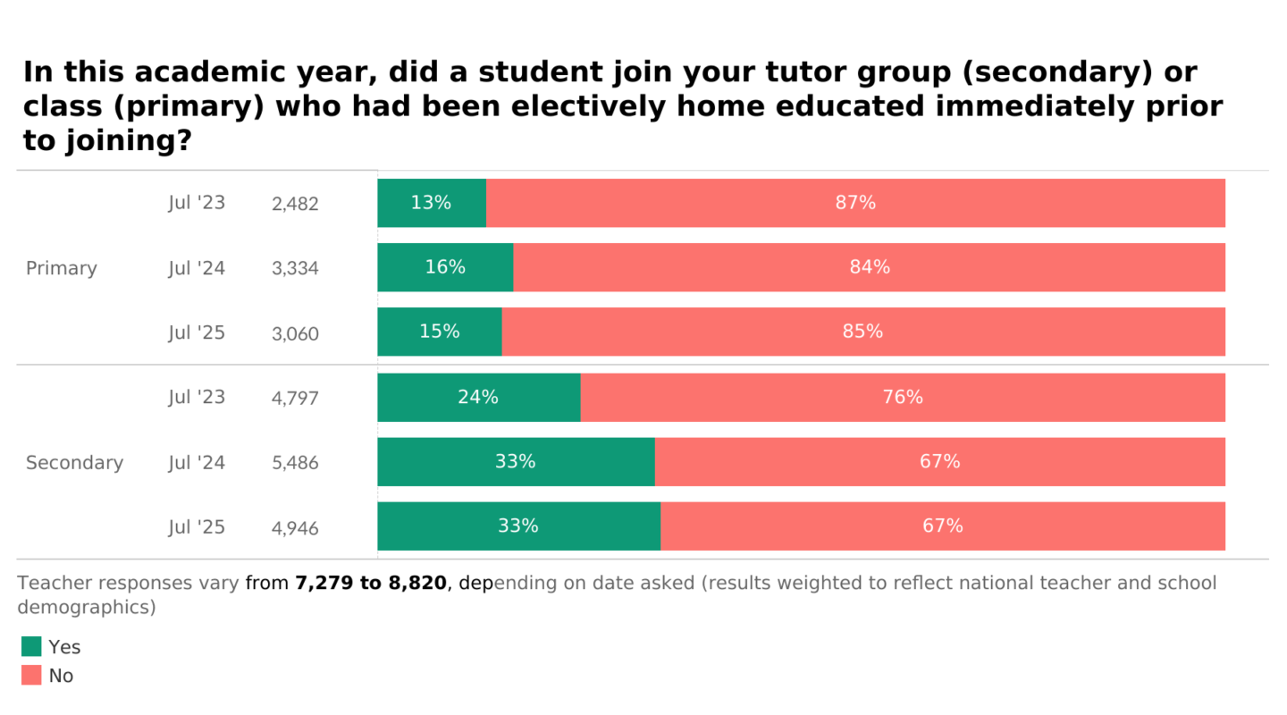 And for a while, that seemed to be true. Between 2023 and 2024, the proportion of teachers who said pupils were leaving to be home educated jumped: up 7 percentage points in primary (from 10% to 17%) and a huge 10 points in secondary (from 25% to 35%). But this year, the trend has slowed.