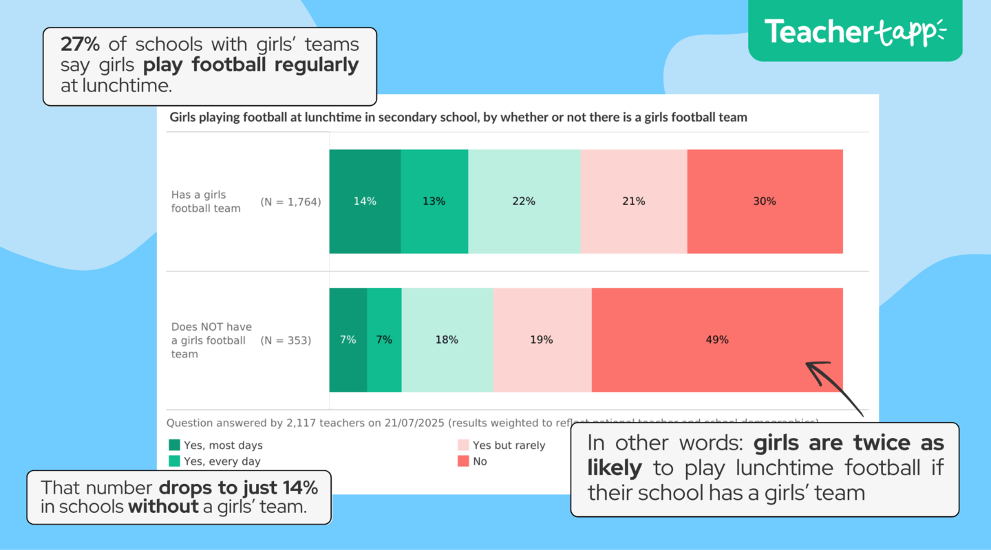 Meanwhile, boys’ lunchtime football remains steady and sky-high, with 83% of primary and 91% of secondary teachers saying it happens most days. So yes, boys still dominate the pitch—but the grass is starting to even out. What’s behind the shift? One big factor is school teams. In primary schools, girls’ football teams have surged from 37% to 51%, nearly catching up to boys’ teams at 53%.