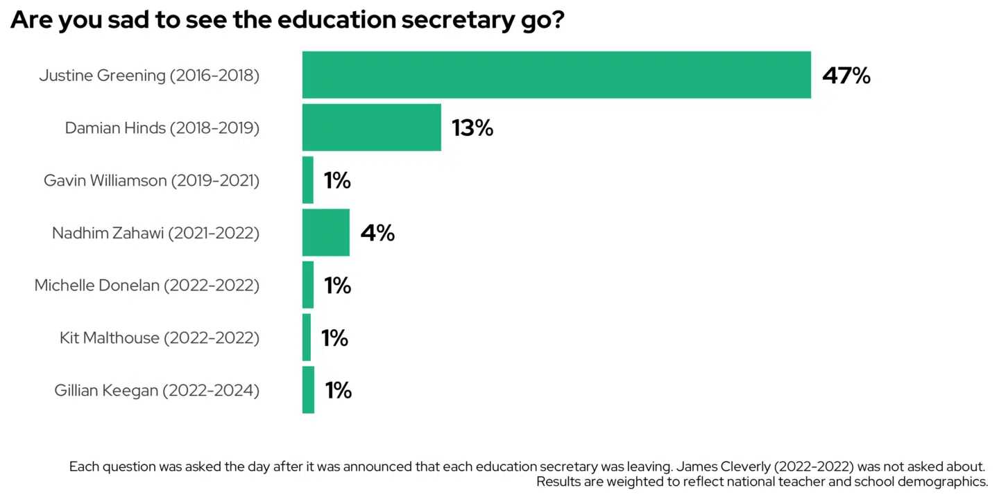 As always, we asked if you were sad to see the education secretary go. We didn’t have huge numbers expressing sadness that Gillian Keegan was leaving, however her result isn’t out of step with the other numerous Ed Secs who held the post following Nadhim Zahawi’s departure in 2022.