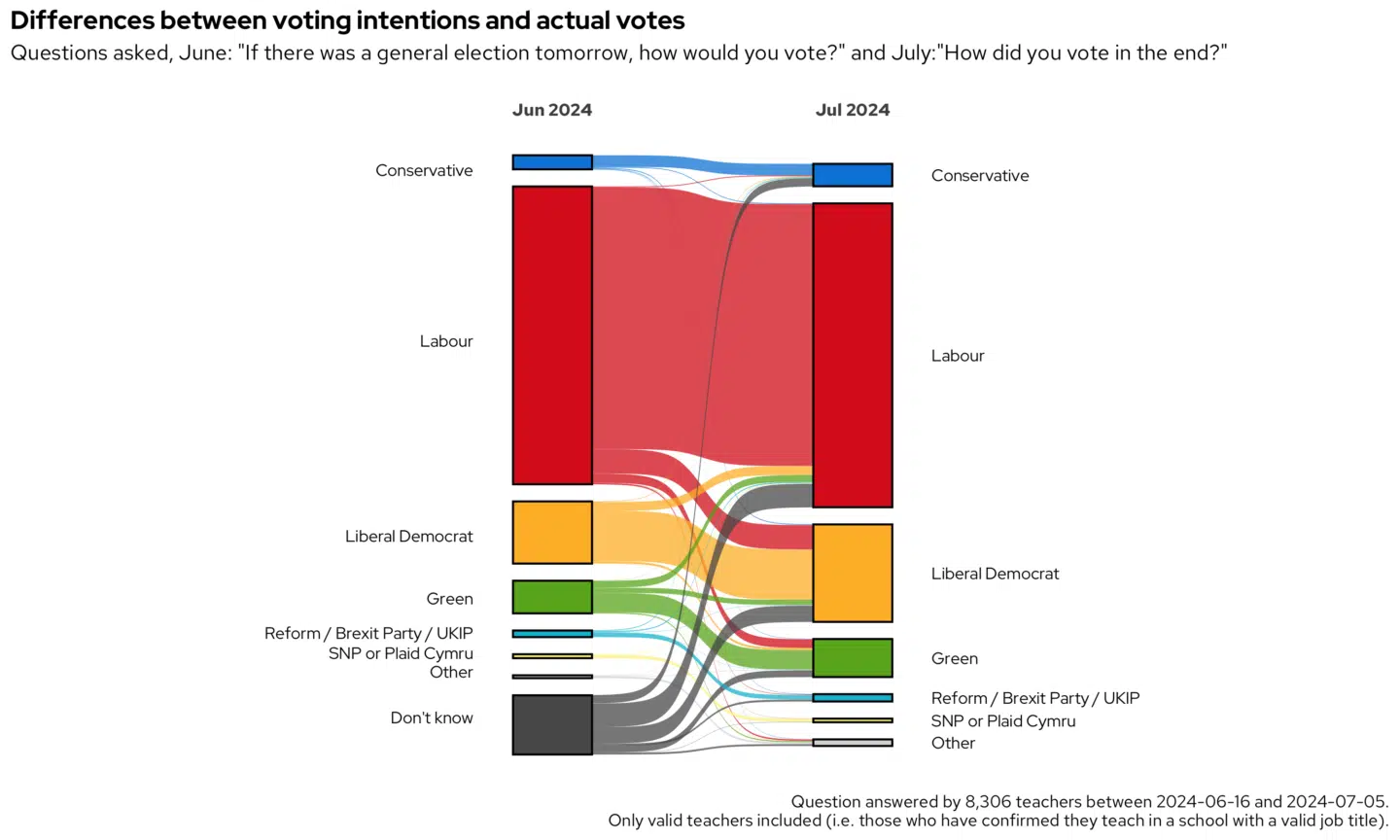 Compared to the 2019 election, there were fewer Conservative voters (5% vs 10%). Another shift can be seen in votes for smaller parties: 0% voted for BNP or UKIP in the last general election whereas this time Reform secured 2% of the vote.