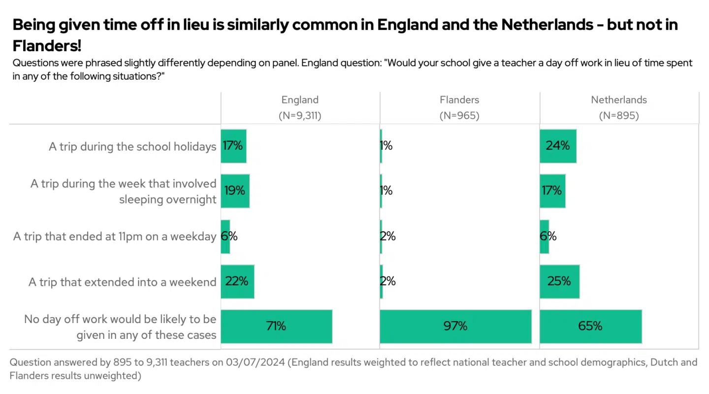 🇧🇪 Teachers in Flanders were the LEAST likely to be given time off after being on a school trip (97% saying no days off for trips that run into non-working time).