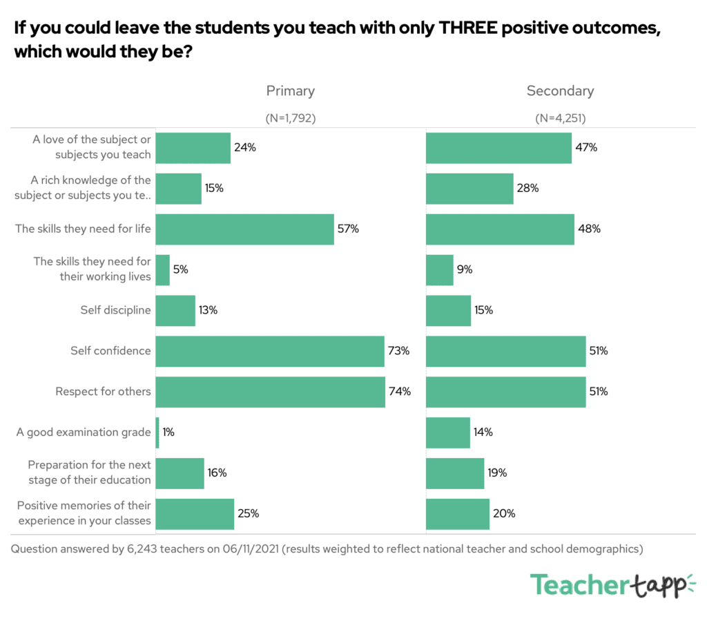 Above all, Primary teachers selected respect, self-confidence and giving students essential life skills as the three biggest outcomes they wanted to leave students with.