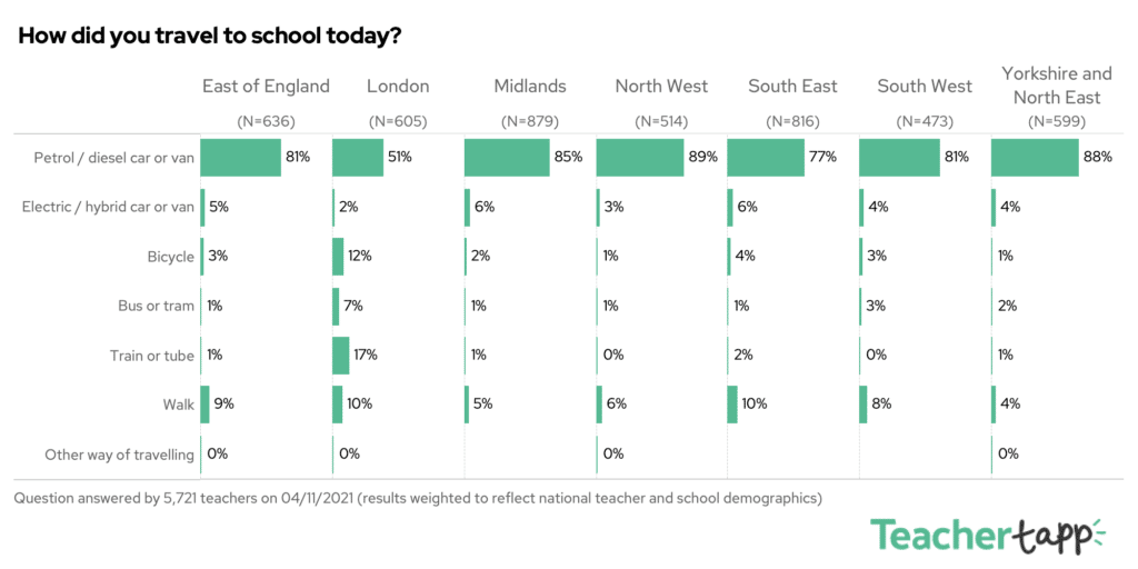 London is the only ‘entirely city’ region so it’s also not a shock to find that it has the lowest number of drivers – but, even there, over half of teachers arrive by their own four wheels. Just 17% take the tube and 12% cycle.