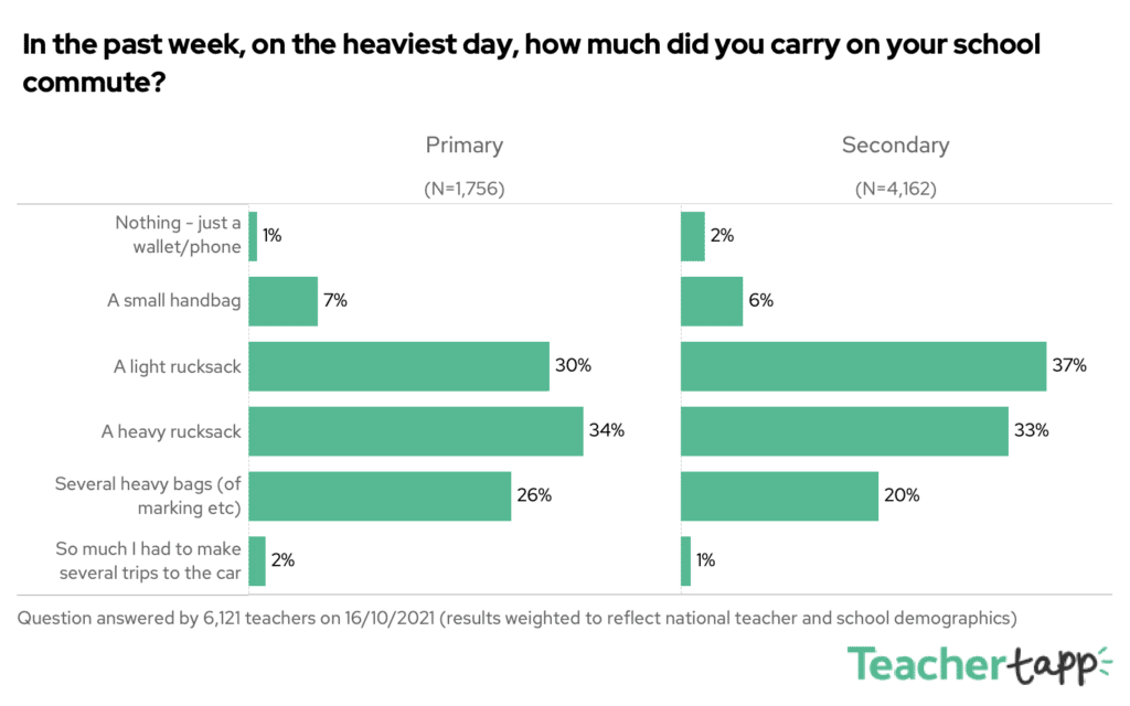 Over 50% of teachers carry at least one heavy rucksack to work on at least one day per week, making cycling all the more difficult. And 28% of primary teachers are carrying several heavy bags!