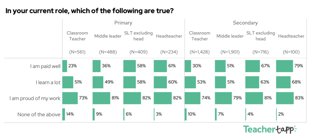 Hearteningly, over three-quarters of tappers are proud of their work and over half say are learning a lot in their role. Pay is less heartening, though secondary teachers and headteachers do quite better on this score.