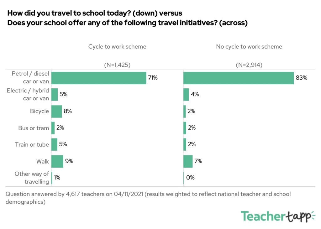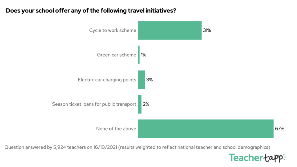 Some schools offer incentives to encourage a greener method of travel. One in three schools offers a cycle-to-work scheme which reduces the cost of bikes for staff. And those schools do have much higher rates of cycling, with staff in those four times more likely to travel by bike than in a school without a cycle-to-work scheme. (Of course, it might be that because more staff travel by bike that’s why the school introduced the scheme – but, in any case, it seems like it can’t hurt to try it out!)