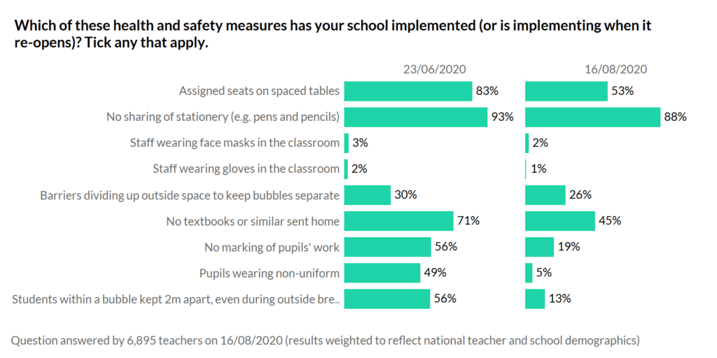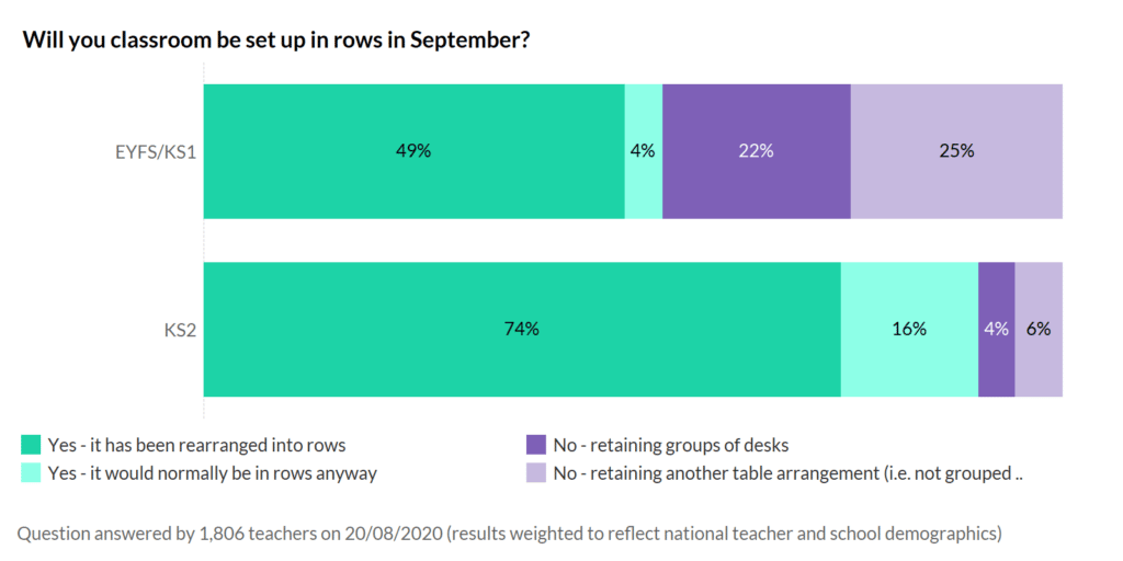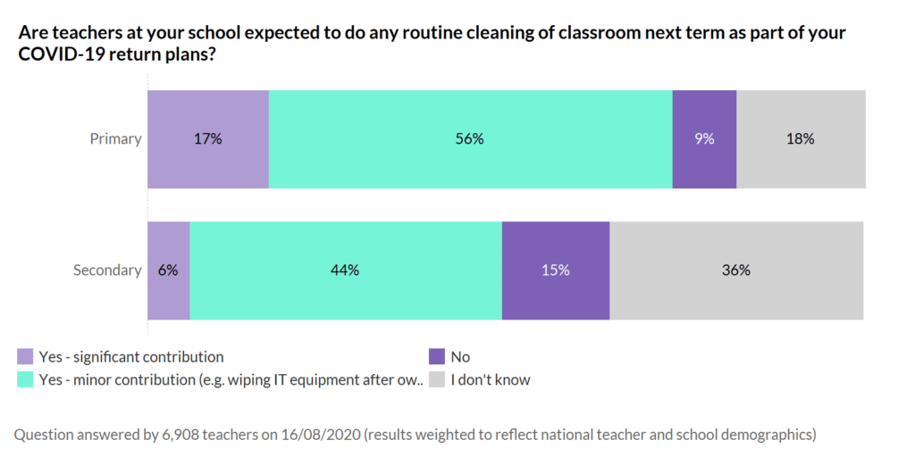 A teacher got in touch to ask us whether teachers are expected to clean next year. The answer is generally yes when it comes to wiping down equipment and other small tasks that need to be carried out multiple times a day. (We were amused that a third of secondary teachers don’t yet know what their daily routines will be like – it is often the case that primary teachers seem better briefed on arrangements.)