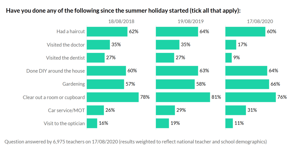 We are fast hurtling towards the end of the holidays. (Some of you may already have finished!) Each year we ask what routine chores and activities you’ve done this summer. In many respects this summer is similar to others – you’ve been having haircuts, doing DIY, gardening and generally having a clear-out of your house. However, unlike other years, you haven’t been visiting the doctor, dentist or optician much – not least because some of these services are not back to usual as yet. Let’s hope you can find time to catch-up once term begins.