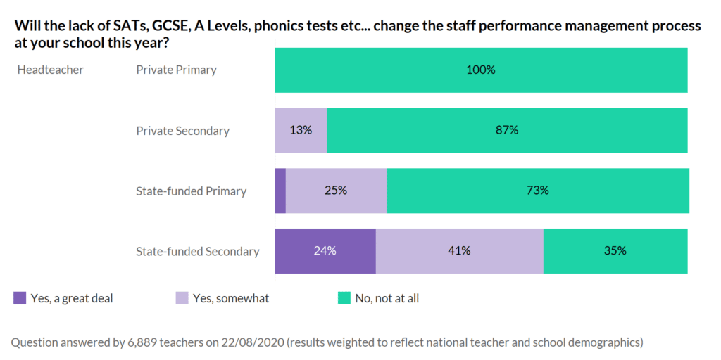 Finally, one side effect of the lack of government assessments will be the inability to judge you on the students’ performance! We asked you all about changes to performance management as a result but have drawn out the headteacher responses here. They suggest that just a third of state secondary schools DO NOT rely on exam results to judge teachers in a normal year.